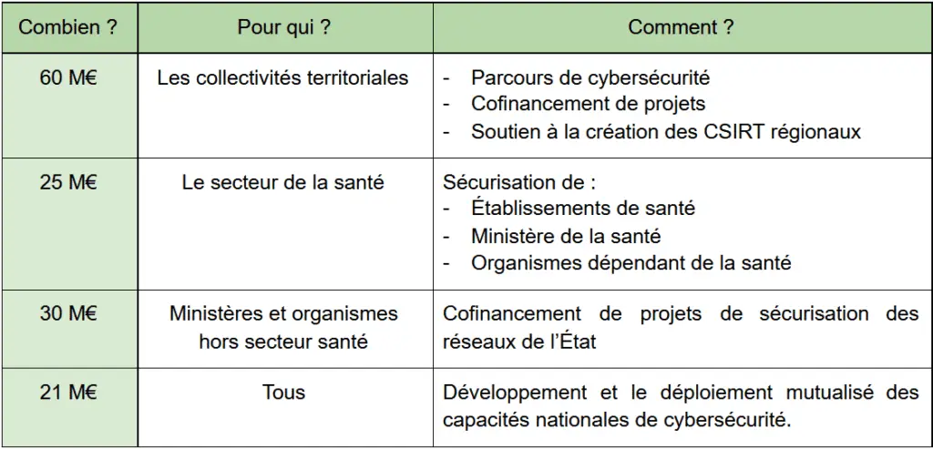 Un fonds de 136 millions est spécialement dédié à la cybersécurité et piloté par l’Agence Nationale de la Sécurité des Systèmes d’Information, ayant comme objectif d’élever durablement le niveau de cybersécurité de l’État, des collectivités, des établissements de santé et des organisations au service des citoyens, tout en développant le tissu industriel français de cybersécurité.
